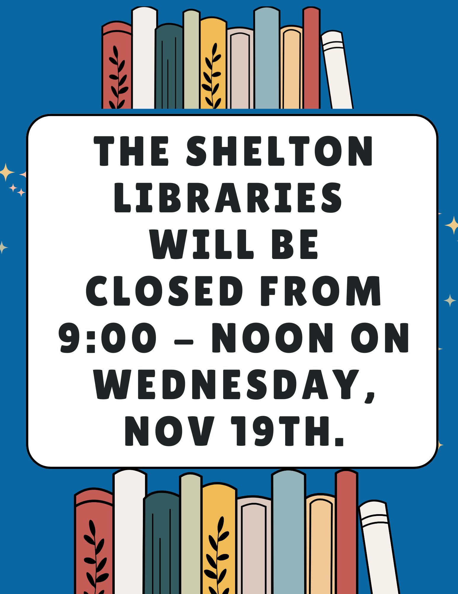 The Shelton Libraries will be closed from 9am to noon on Wednesday, November 19th